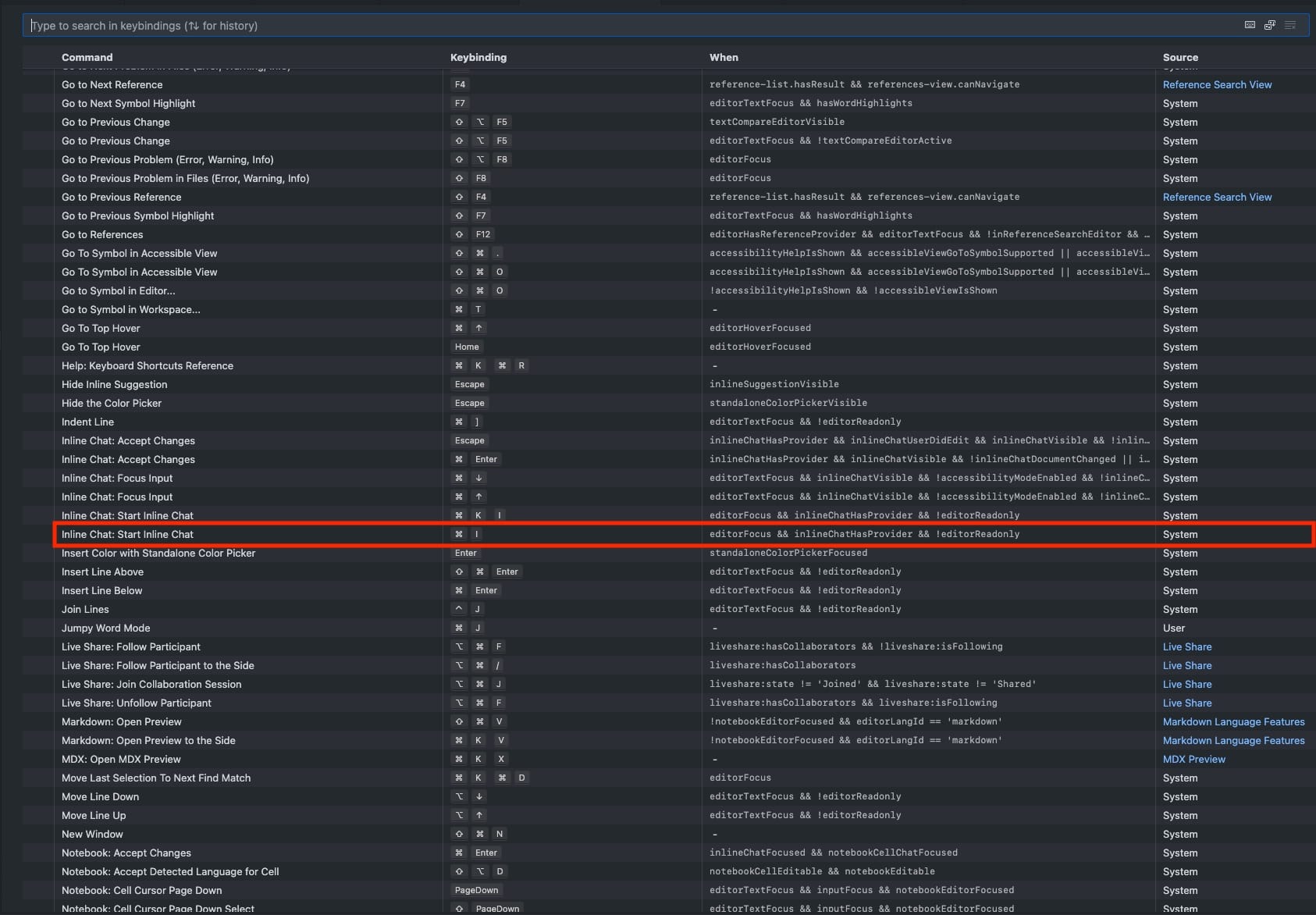 - Search for "Chat" or more specifically it is "Inline Chat: Start Inline Chat"